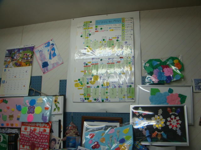 (子供達の力作が壁にズラリ。中には部活の告知などあり、楽しい!)