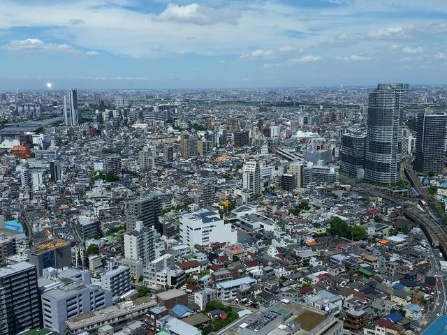 (スカイツリーより下界を接写。右が曳舟。正面が荒川・墨田川のデルタ)