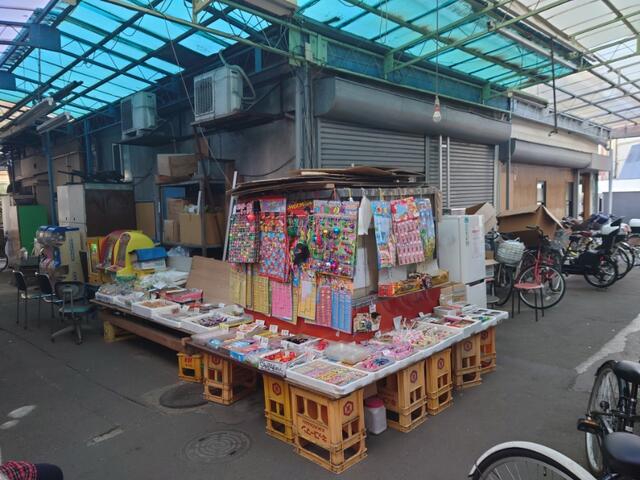 (自転車と駄菓子が並べられる商店街内に、子供達に愛される駄菓子屋がある)