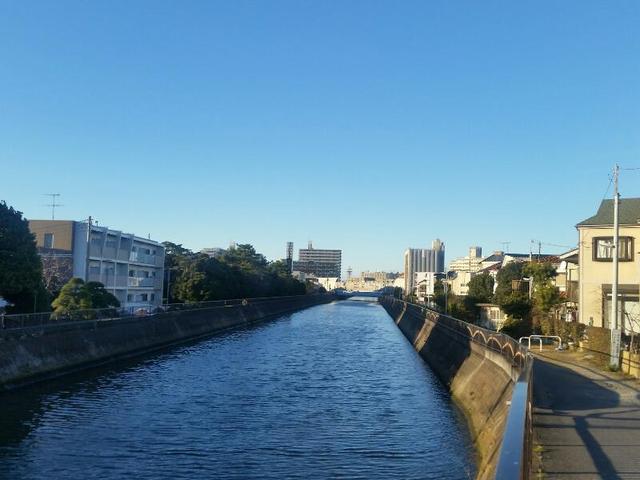 (都会の喧噪をのんびり流れる真間川。彼方に見えるは京葉道)