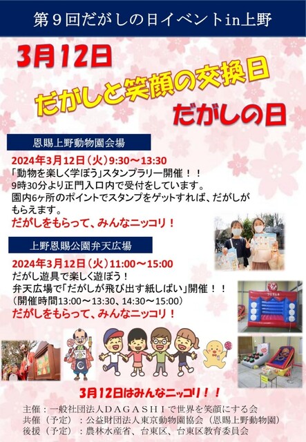 今年もやります!3/12【駄菓子の日】 2024年03月09日 06:30 3/12(火)は【駄菓子の日】全国各地で、駄菓子⇔笑顔が織りなす素敵なイベントが各種開催予定です。お近くの会場で、駄菓子屋さん・団体さんで、皆さんのたくさんの笑顔お待ちしてま〜す!!ご近所で開催予定かどうか?お調べになって、遊びに行かれては如何でしょうか??※恩寵上野動物公園会場のイベントを添付致します 「駄菓子屋 あれこれ」カテゴリの最新記事 タグ :#Dagashi(Traditional-Japanese-popular-Candy・Snack)#駄菓子の日#駄菓子 < 前の記事次の記事 > コメント このブログにコメントするにはログインが必要です。 さんログアウト この記事には許可ユーザしかコメントができません。 コメントフォーム 名前 コメント 評価する リセット リセット 顔 星 投稿する 情報を記憶