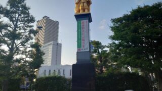 (JR・名鉄線の岐阜駅前に鎮座する黄金の信長公。『岐阜』の名付け親でもある)