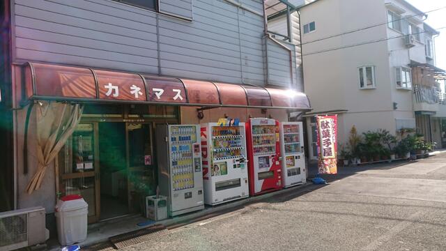(カタカナで書かれた味のある『カネマス』の文字。駄菓子屋の幟が目印)