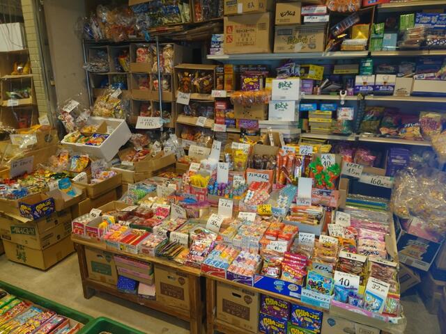 (両脇に駄菓子の棚が鎮座し、動線の先に光る冷蔵庫には飲料が盛りだくさん!)