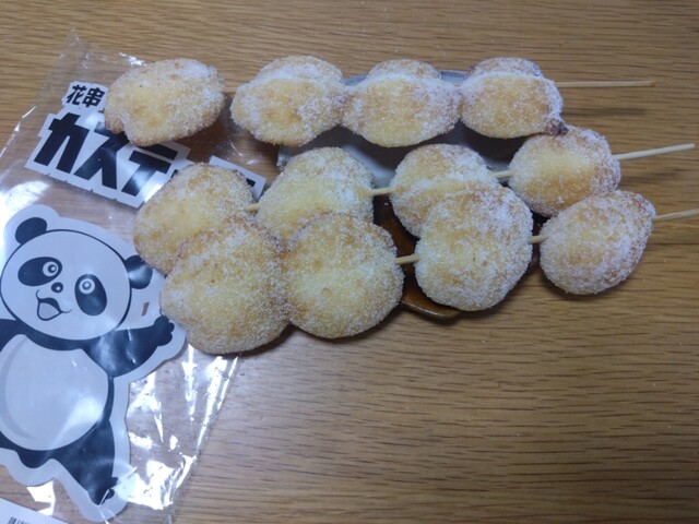 串に刺刺され砂糖がまぶされた不揃いのカステラ達